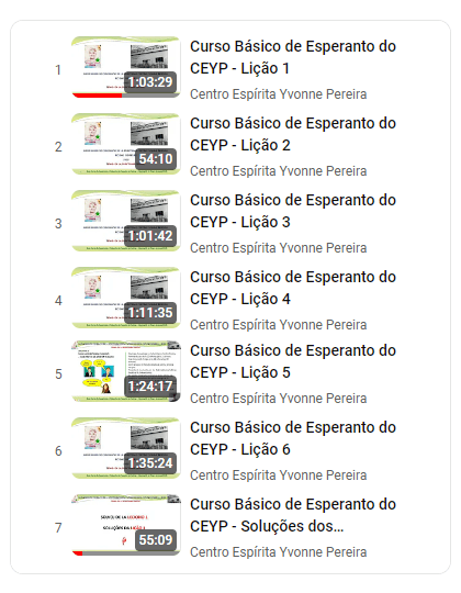 En 2020 (urbo Rio-das-Floro, Brazilo), Spiritisma Centro Yvonne Pereira (CEYP) publikigis bazan Esperanto-kurson por spiritistoj en sia jutub-kanalo.