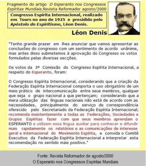 En 1925 en Tours la Internacia Spiritisma Kongreso, prezidita de Léon Denis (la Apostolo de Spiritismo) rekomendis al la spiritismaj asocioj lernigi siajn membrojn pri Esperanto. Jen sube ero de la okazintaĵo, el la prezidanto de la kongreso.